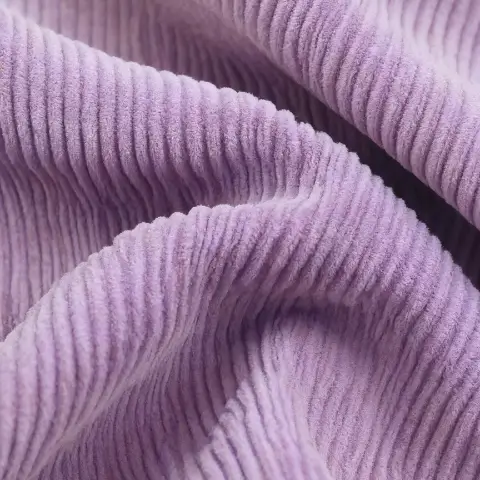 Corduroy is a durable cotton fabric known for its distinct vertical ridges, often used for pants and jackets.